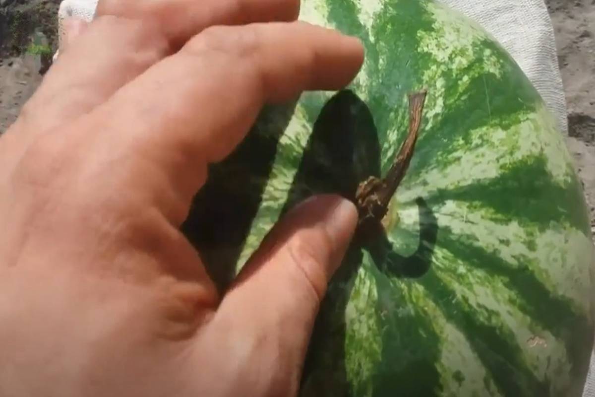 Esse é um detalhe que muita gente ignora: o talo da melancia. Se ele estiver verde, significa que a fruta foi colhida antes da hora. Já o talo seco revela que a melancia teve tempo de amadurecer naturalmente, o que garante mais doçura e sabor.